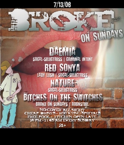 July 13th, 2008, We’re Broke on Sunday… featuring an all female DJ Lineup including Red Sonya, Nature, Daemia, Eva & Alikat.